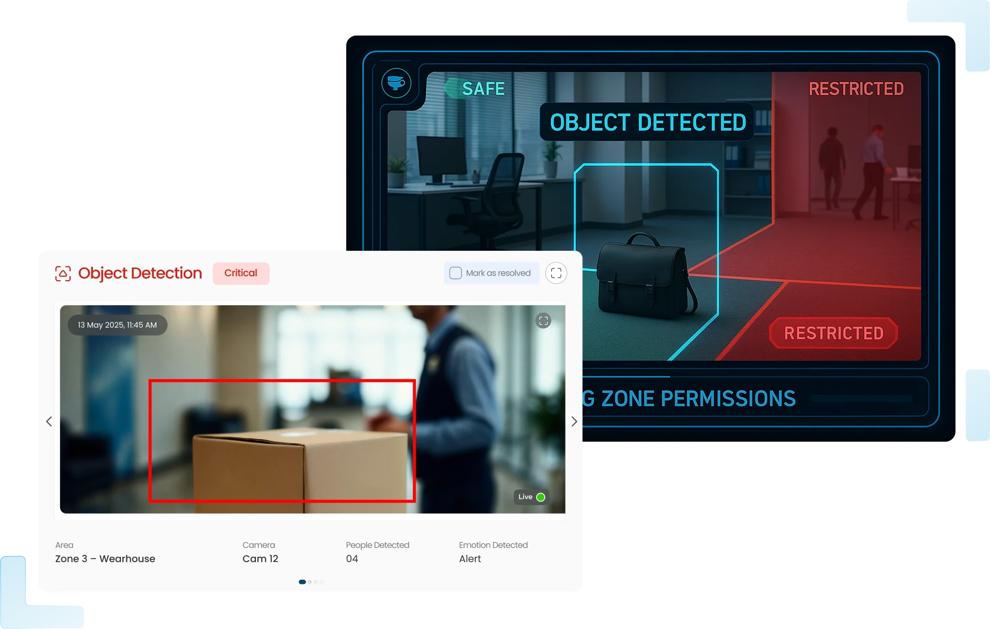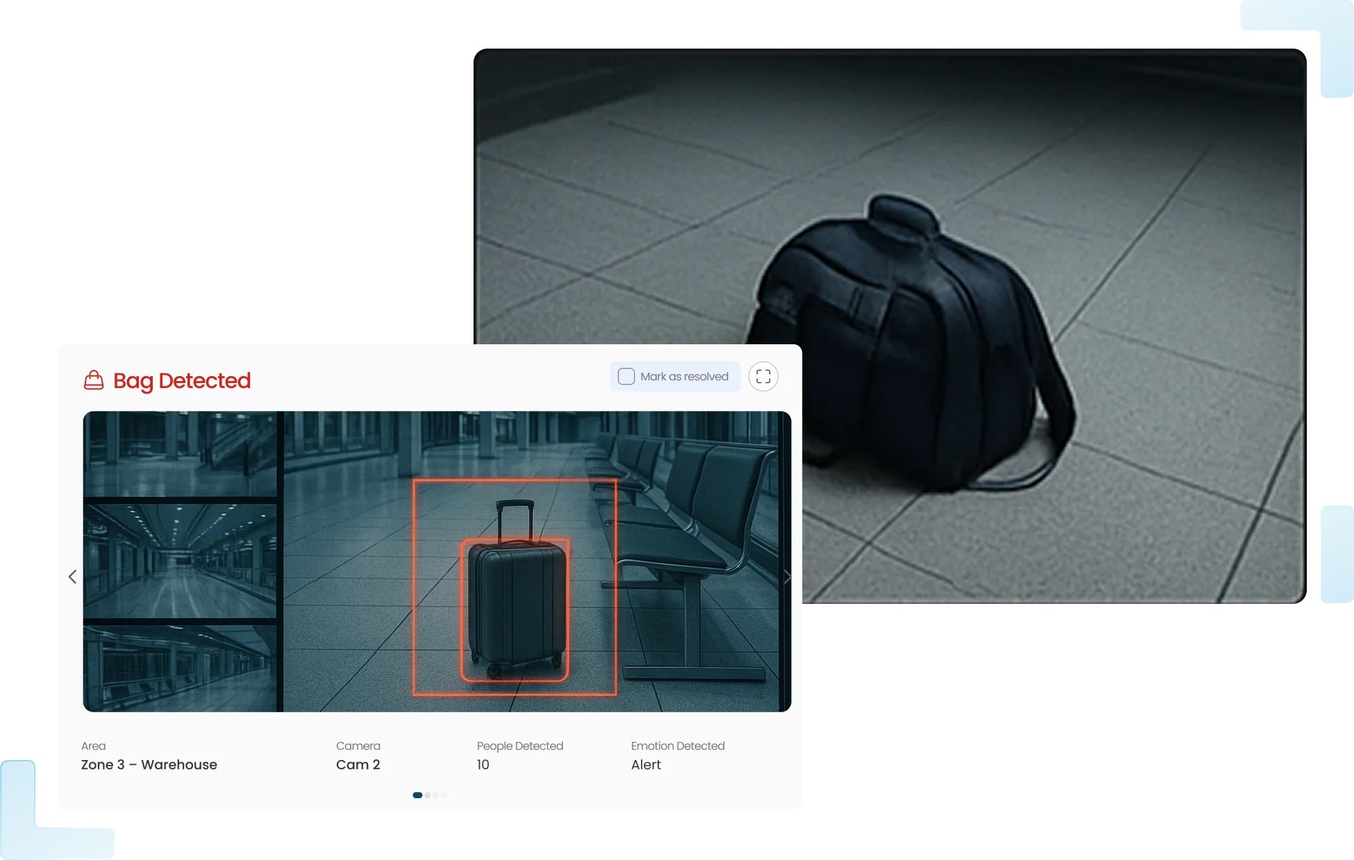 AI identified and flagged unattended objects left in sensitive areas like showrooms or customer lounges, enhancing threat detection and supporting preventive protocols.