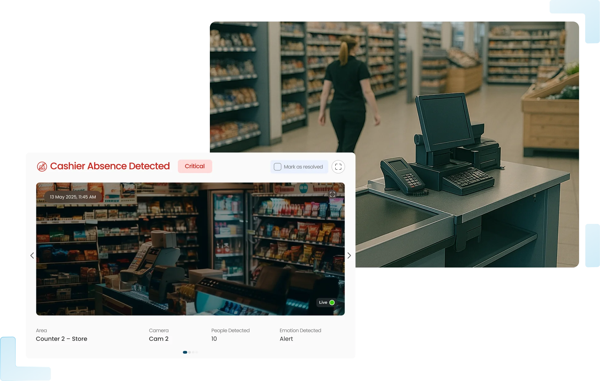 Counters left unmanned for longer than set thresholds triggered instant alerts. Managers could track downtime and investigate delays or inconsistencies in service.