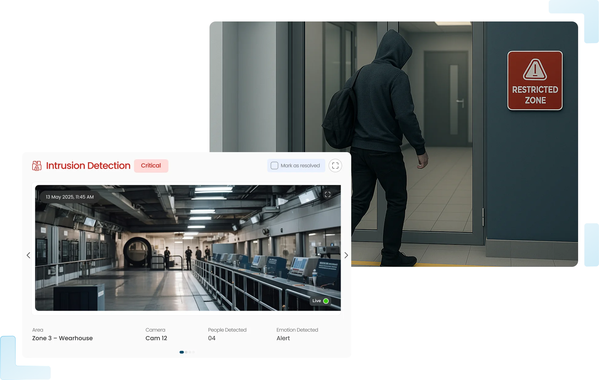 Restricted spaces like parts inventory, cash counters, or service bays were monitored for unauthorized entry using motion and line-cross detection, triggering alerts when breached.